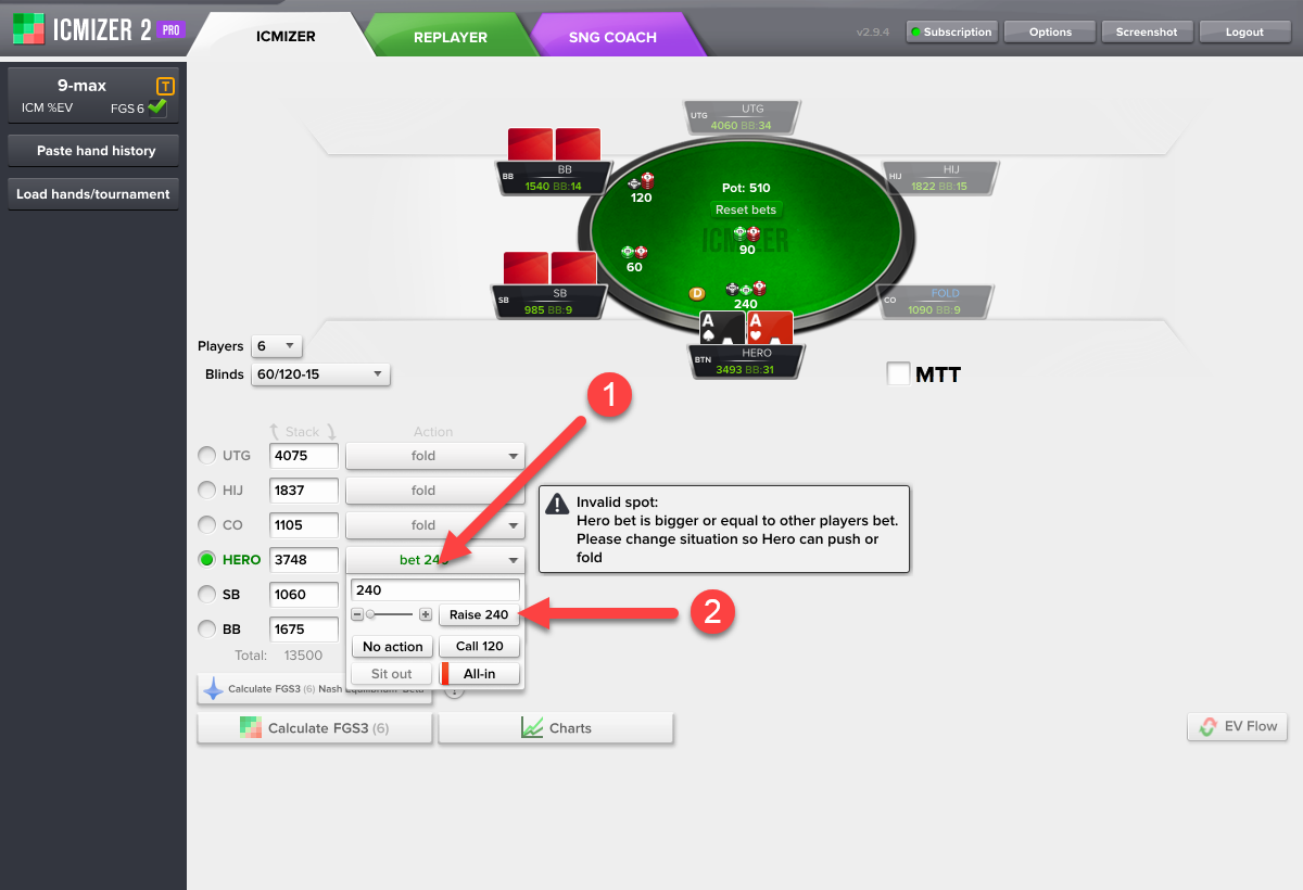 现在我们需要为Hero设置正确的下注额(如果牌局是使用粘贴功能载入的,下注额将自动设置好)。如图,点击HERO旁边的“action”编辑器,将加注额设置为240,然后点击“raise 240”按钮。