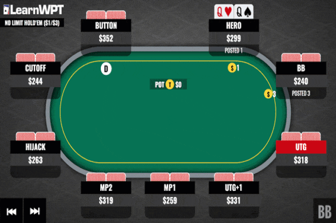 在一个盲注1/3美元的现金局中,我们翻前在小盲位置用口袋QQ再加注,对抗一个前面位置的加注者和一个后面位置的跟注者。只有前面位置的玩法跟注,然后我们在不利位置看到一个A高翻牌面。