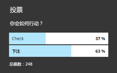 因为这些原因,check是这个特定场合更好的玩法,也和我们的标准策略有偏差。一般而言,在这类场合,我们应该乐意在翻牌圈check后跟注一条街的下注。