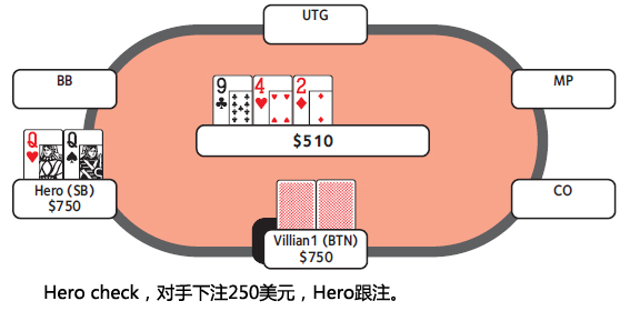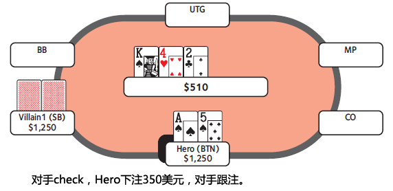 这是一张对Hero最可能好的转牌。他不是拿900美元冒险去赢取1200美元,而是拿900美元冒险去赢取2100美元,因为如果对手跟注,他有约34%的胜率。只要拿底池总额乘以Hero的胜率,就能算出他被跟注时的期望值:3000美元的34%是1020美元。即使对手从不弃牌,Hero在EV上也净赚120美元。Hero