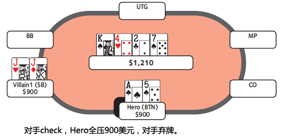Hero全压,希望得到TT、99、A4s、A2s甚至是A高牌的跟注。对手弃牌,但这并不要紧,因为Hero榨取到了最多的价值。