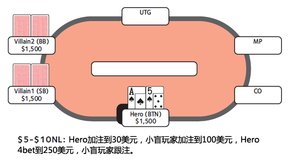 这是适合继续游戏下去的最可能好的一个翻牌面。Hero的范围是无上限的。他的范围中包括KK+和AK。大多数对手会用这些组合翻前5bet全压。很少有对手会用非同花Kx组合跟注4bet。