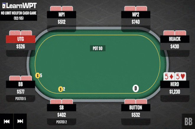 有可能我们在翻牌圈弃掉的口袋对5是当时最好的一手牌,但这完全没有问题。我们在翻牌前选择游戏这手牌时就对翻牌后的行动立下了一个特定的计划。