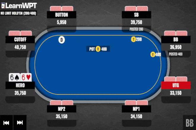 这手牌来自一场无限德州扑克锦标赛。当时盲注200/400,前注50。桌上玩家筹码量如图。翻前,前面玩家都弃牌,你在劫位(hijack)用6♠ 6♥率先加注到2.5BB,CO玩家弃牌,然后按钮玩家(约15BB)再加注到全压。两个盲注玩家都弃牌,轮到你行动。你会如何行动?