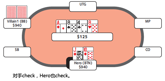 这张8♥对于Hero是未现牌中最糟的牌。对手若拿到了一张A或一张8绝对不会放弃。Hero没有获得任何胜率,不得不在转牌圈放弃进攻。他没有任何办法在转牌圈或河牌圈产生33%的弃牌赢率。因为Hero在翻牌圈为了增加他的二次连续下注频率而采取了一些措施,这是完全可以接受的。