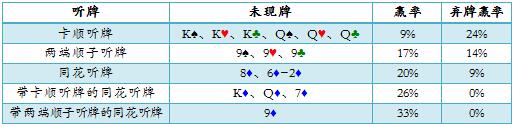 弃牌赢率这一列表示:如果Hero拿到了听牌,他需要对手转牌圈在多少时候弃牌。假设转牌是Q♠。通常对手需要在33%的时候弃牌才能使Hero的半池下注诈唬盈亏平衡。但现在Hero将在9%的时候改进成最好的牌。Hero只需要对手在24%的时候弃牌即可盈亏平衡。