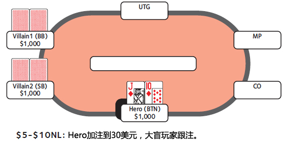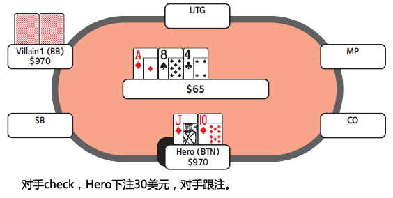 我们容易看出,Hero可以制造超过9%的弃牌赢率。对手有很多被Hero锁定的弱对子:88-TT、33-66、87s、76s。