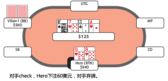 那么转牌是9♦又会怎样呢?如果Hero下注60美元然后被跟注,底池将有240美元。Hero的60美元半诈唬将是底池大小的25%。但Hero将在33%的时候改进成最好的牌。某些听牌特别强,即使对手从不弃牌,用它们下注也是有利可图的。