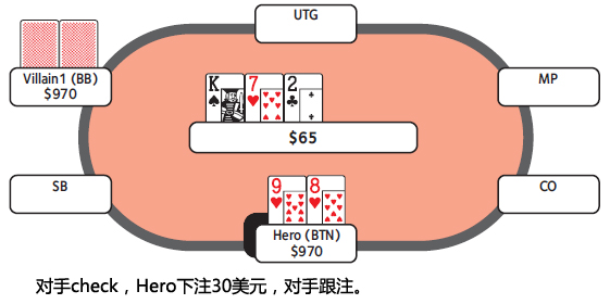 Hero在这个翻牌面有巨大的范围优势。他的范围中包括AA、AK、KK和K7s。对手通常没有这些组合,因为他翻前会用前三手牌做3bet,并放弃K7s。为了给对手的弱大高张、没击中翻牌的同花连子和小口袋对子施压,Hero应该用很高的频率做持续下注。