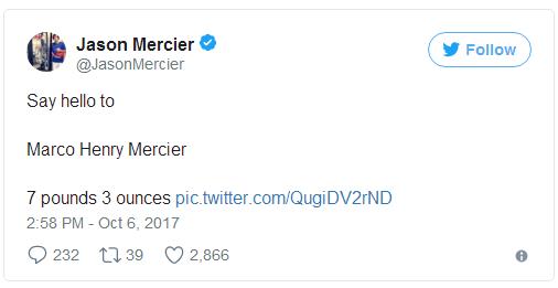今早凌晨,扑克之星战队成员Jason Mercier通过推特向外公布妻子Natasha成功诞下一名7榜3盎司的男婴,并起名Marco Henry Mercier。