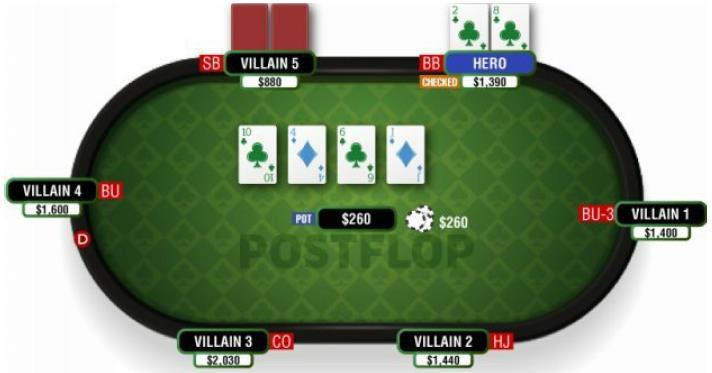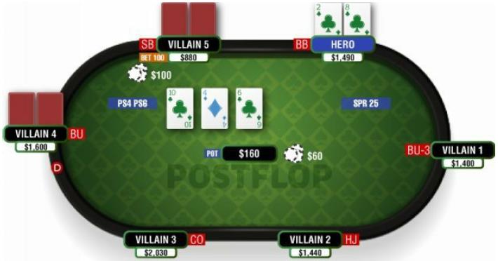 这是某个SNG比赛一级盲注阶段的一手牌。按钮玩家翻前跛入,小盲玩家补满,我在大盲位置拿着8♣ 2♣check。翻牌是T♣ 4♦ 6♣:(PS4、PS6翻后场景,SPR为25)