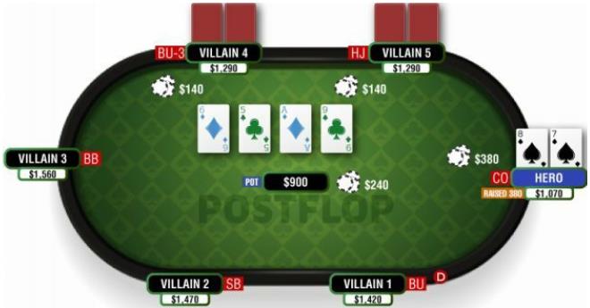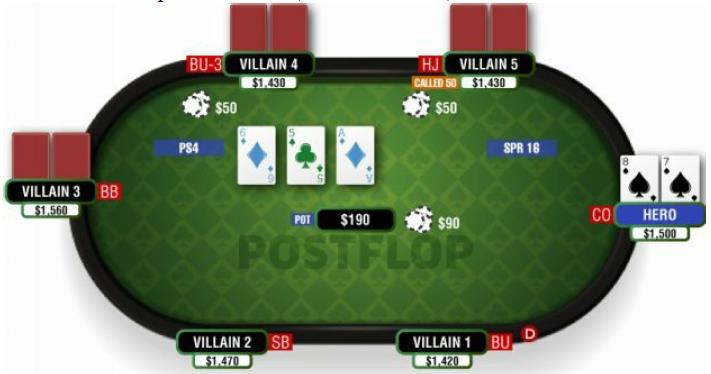 在多人底池的深筹码场合,你应该在后面位置用同花连子便宜地入局,否则你应该在翻前采用要么加注要么弃牌策略。避免用同花连子跟注昂贵的加注。这里有一个在SNG早期适合在多人底池游戏同花连子的好场合的例子。我在CO位置用7♠ 8♠跛入,看到翻牌是6♦ 5♣ A♦:(PS4翻后场景,SPR为16)