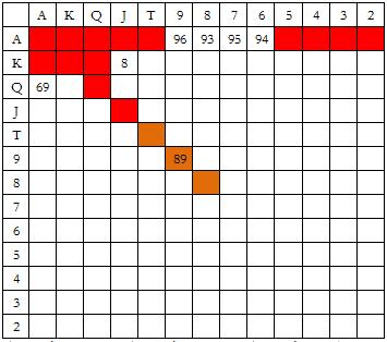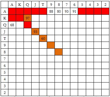 说明:红色方块表示加注,橙色方块表示跟注,白色方块表示弃牌,方块中数字表示加注的百分比。