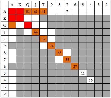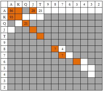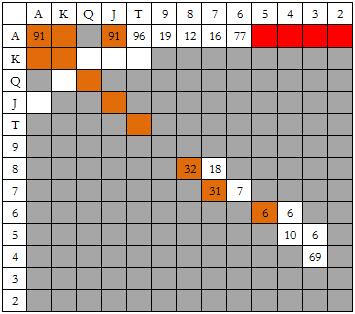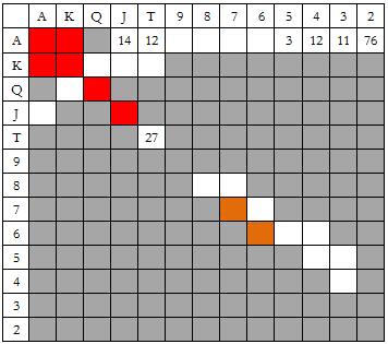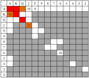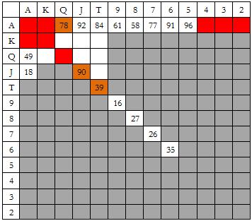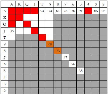 这是最后一张小盲玩家和大盲玩家对抗的图表。我只是想告诉你,在这种情况Snowie会用所有对子和大多数大高张5bet全压100BB筹码。许多人认为这是最烧钱的做法。