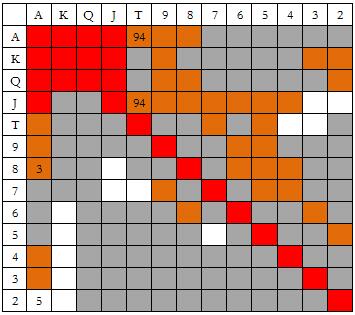 说明:红色方块表示加注,橙色方块表示跟注,白色方块表示弃牌,灰色方块表示未在范围中,方块中数字表示加注的百分比。