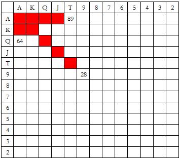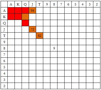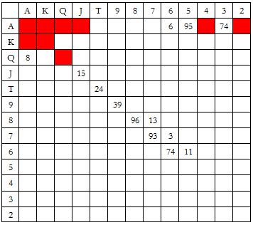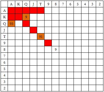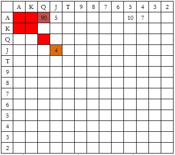 你的4bet范围应该缩减,因为CO玩家的率先加注范围有点紧。基本和前例一样。使用这个范围对抗出色的、有竞争能力小盲位置3bet玩家。对抗其他人,这个范围应该更可能是JJ+和AK。