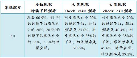 4. 随着筹码量变浅,按钮玩家应该预计大盲玩家做更多的eheck-raise。下注小一点使得check-raise不太有效,所以在这种场合按钮玩家应该考虑在翻牌圈使用非常小的下注尺度。如果大盲玩家在翻牌圈真的跟注,那么按钮玩家将知道,他不太可能是强牌。然后按钮玩家可以考虑在转牌圈下注大一点,甚至全压。