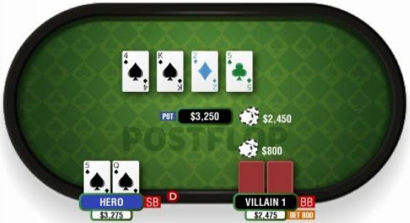 这是一个单挑局面下的PS1翻后场景,我有23BB筹码。翻前,我用黑桃Q5在有利位置加注,拿到了同花听牌,做持续下注,被最小check-raise。转牌圈公共牌面是4♠ K ♠ 2♦ 5♣,现在我面对一个赔率基本合适的转牌圈下注。