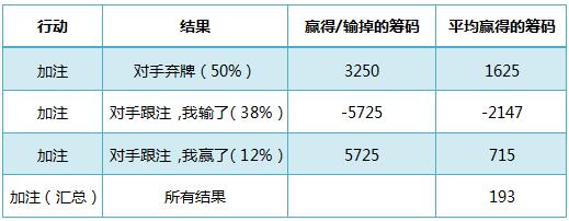 如你所见,虽然两个选择都是盈利的,但即使加注有50%的弃牌赢率,跟注仍然是更好的选择。这个表格对于希望了解如何从数学上拆解这类场合的人很有用。