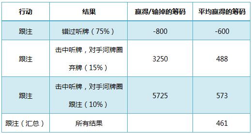 现在我们做一些假定,从数学上分析这个选择。首先,我们假定我的摊牌盈率平均而言是25%。其次,我假定对手的弃牌率是适中的50%。现在我们来看看在这个场合跟注或加注(假设加注是全压)可能的结果。