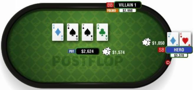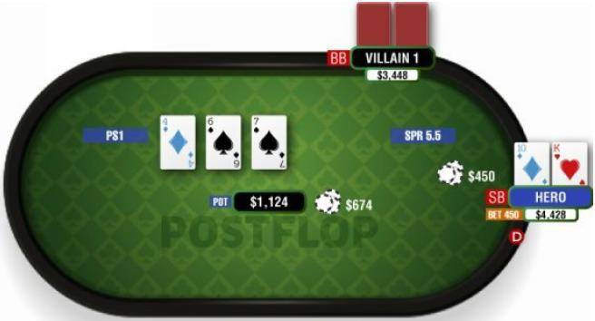在这个例子中,我在按钮位置用KTo加注,和对手单挑。对手跟注,翻牌是4♦ 6♠ 7♠:(PS1翻后场景,筹码底池比为5.5)