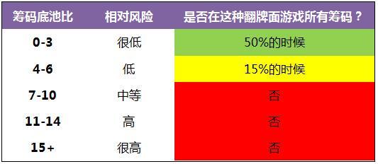 我还是列出了SPR表格,但你游戏所有筹码的意愿主要取决于你的底牌和翻前的下注行动,而不只是瞟一眼表格。