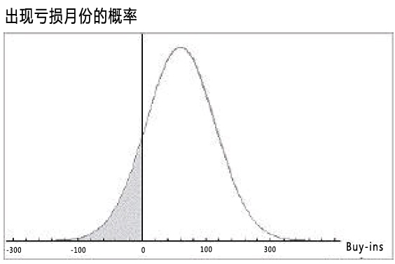 解答:1200场SNG是一个足够使用正态近似的样本规模。你预期的结果是一个月后赚到60个买入费。标准方差是1.5 x 1200的平方根,约为52个买入。盈亏平衡或亏损将是偏离平均值60/52≈ 1.15个标准方差。通过使用一个值表,我们查出12.5%的时候正态分布低于平均值1.15个标准方差,因此我们出现亏损月份的概率是1/8。也就是低于钟型曲线1.15个标准方差的部分,或者中央偏左的部分。
