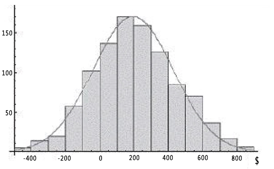 我们假设1000名牌手有着同样的扑克水平,而且他们都相互对抗打了200场11美元买入的单桌锦标赛。虽然他们采用相同的游戏方式,但他们的结果将不一样。有些经常取胜的人说:“对我来说,扑克很容易!”有些老输的人说:“这么糟糕的连败简直难以置信。我啥也赢不到!”但大多数人的结果和长期而言的平均结果相差不远。他们的扑克结果图表可能看起来像下面这样子: