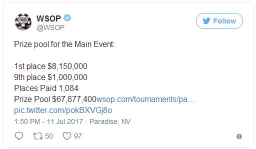 这是WSOP主赛事历史上的第三大选手阵容,最高纪录在2006年,报名人次为8773,其次是2010年的7319人次。今年奖池为$67,877,400,冠军保底奖金$8,150,000。