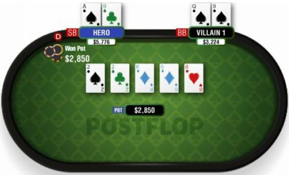 因为我是单挑,所以对手的跟注范围足够松到让我相信我的A高牌可以在这手牌的所有阶段一直领先。当对手跟注我的标准持续下注时,我不得不担心他可能拿着一张K或一个口袋对子。如果我在转牌圈再次下注,可能只有已经打败我的牌跟注。随后check允许我便宜地打到摊牌,也制造了对手在河牌圈诈唬的可能性。这恰好也是这手牌发生的情况——对手河牌圈做了一个40%底池大小的下注,为了增加了一笔可观的盈利。