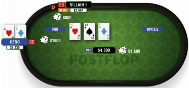 在PS1场景对抗一个对手时,做持续下注仍然是标准玩法,也将获得少量收益。如果你被跟注或加注,这通常是你的牌已经输了的信号。如果牌局进行到转牌圈,除非你翻前玩得超级紧,平均而言你将输钱。