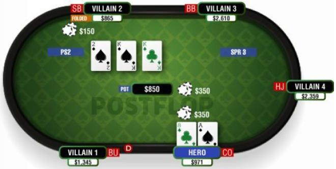 对于所有的翻牌场景,我都不建议在多人底池下注。在PS1翻后场景中,你可以尝试用持续下注对手2个对手,但你需要相信你有很好的机会让两名牌手都弃牌,而且公共牌的对子应该不太可能击中对手范围是小对子。谨记,对于半个底池大小的下注,你的成功率必须至少33%(越高越好)。有时在有利位置随后check,免费看下一张牌将给你更好的价值。任何对多个对手的诈唬将会显著降低成功率。