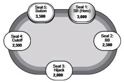 解答:既然你筹码比大盲多,Zare的黄金法则是适用的。有效筹码深度是2500 /200 = 12.5bb。当你在12.5bb深度单挑时,你可以用至少51%的范围全压。这个范围包括Q8、Q2s、J9、T6s、74s、54s这样的牌。