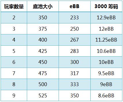 与将大盲注转换成M值不同,你可以自始自终使用一种衡量标准:有效大盲注(effective big blinds,简称eBB)。eBB被定义为初始底池的2/3。在之前例子中,eBB是2/3 x 450 = 300。如果盲注是150/300,起始底池大小将与盲注100/200,前注25的六人桌相同。因此,如果你有一个在按钮位置拿任何Ax牌全压10bb筹码的准则,你在盲注100/200、前注25的阶段也应该拿3000筹码全压。因为拿着10个有效大盲注的筹码,你的风险回报率与在100/200盲注阶段全压2000筹码完全一致。