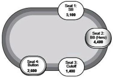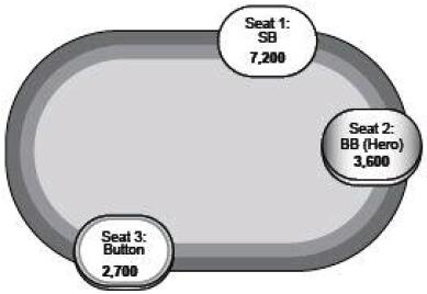例1:9人SNG锦标赛泡沫圈。盲注200/400,还剩下4名牌手。所有人都对全压的小盲玩家弃牌。Hero拿着A8,握有4400筹码。他知道小盲玩家用非常宽的范围全压,但他推断在泡沫圈拿自己的筹码去冒险是不值的。
