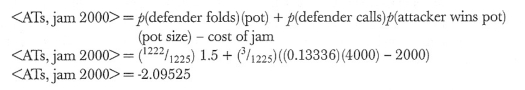 如果进攻玩家全下ATs(增加的第一手牌,正如我们即将看到)在一个2000的筹码量,他的赢率是: