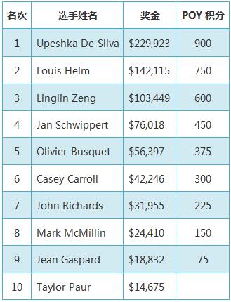 以下是比赛最终结果及WSOP年度最佳牌手(POY)积分情况: