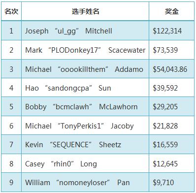 最终来自美国俄勒冈州的Joseph “ul_gg”Mitchell从众多对手中脱颖而出,获得了他的首副WSOP金手镯以及冠军奖金122,314美元。这是Joseph第三次打入WSOP赛事钱圈,也是他拿到奖金最高的一次。Joseph之前最好的成绩是在3000美元Omaha eight-or-better锦标赛获得第九名,奖金22,793美元。
