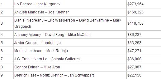 在最后一手牌中,盲注为30,000-60,000,Kurganov加注125,000,Mandavia进行了跟注。翻牌为Qs-9c-8h,Mandavia进行了过牌跟注,下注额为80,000。转牌为Js,双方都过牌,河牌为Kd。Mandavia下注250,000,Kurganov进行全押。Mandavia选择了跟注,Kurganov的底牌为Ah-10d,赢面牌组为顺子。Mondavia的底牌为Qd-10h,赢面牌组也为顺子,只不过比Kurganov小了那么一点点。最终Ankush Mandavia和Joe Kuether.成为本次团队赛的亚军,奖金$169,323。