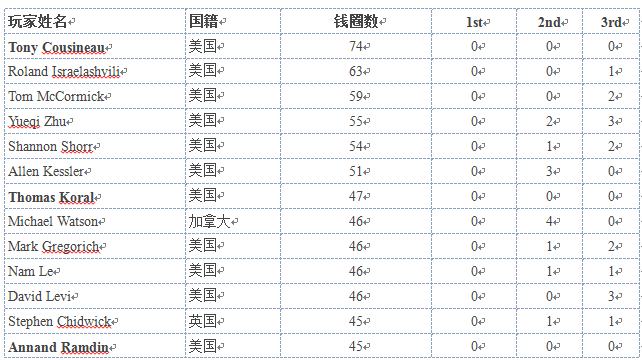 下面是入围钱圈次数多,但却没获得冠军的玩家: