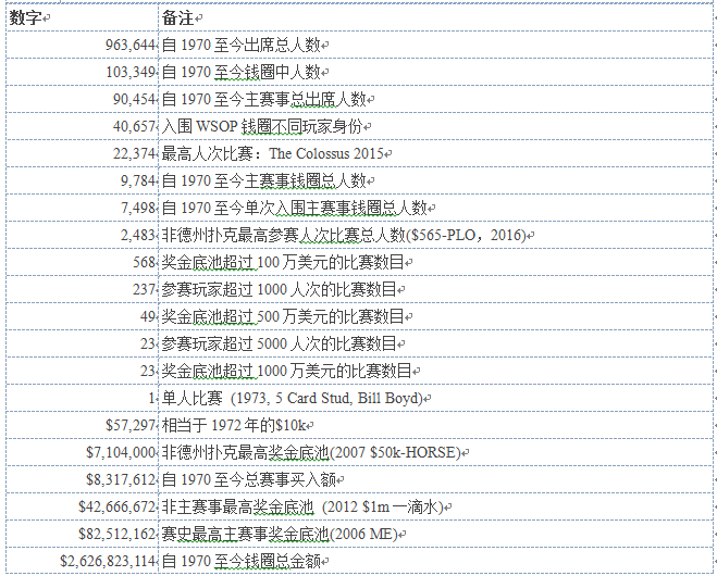 从1970年至今共举办了1325场WSOP比赛,而目前拥有WSOP金手链最多的玩家是Phil Hellmuth,共入围WSOP前圈119次,赢得14条WSOP金手链。