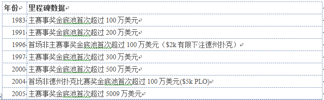 在世界扑克锦标赛的第一个12年中根本没有非美国玩家打入比赛的钱圈。直到1982年才出现了第一位非美国玩家进入WSOP的钱圈。