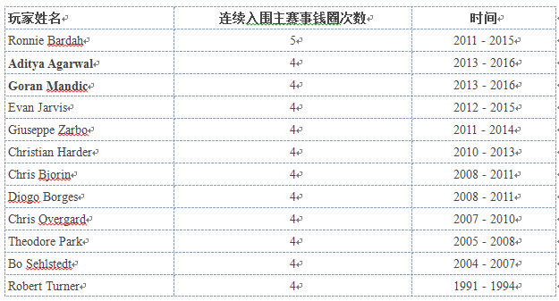 他也许是主赛事钱圈中最悲催的人,但并不是唯一悲催的人,连续4年都没有打入主赛事后期的玩家如下: