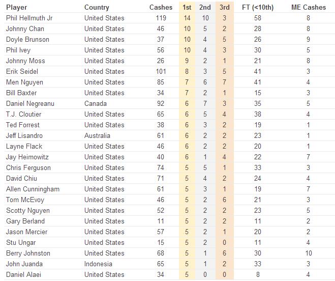Phil Hellmuth进入前3名的次数高达27次,进入决赛桌的次数超过50次。