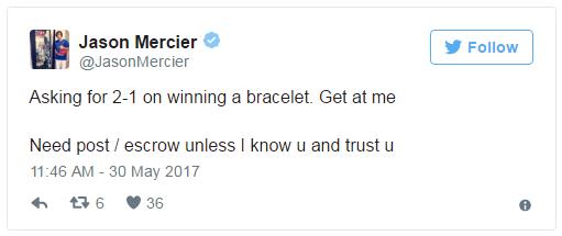 去年,美国职业牌手Jason Mercier和德扑女鲨Vanessa Selbst赌金高达180万美元的金手镯打赌(打赌Jason能否拿到三副金手镯)吸引了许多关注。Jason最终只拿到两副金手镯,功亏一篑。但他以出色的战绩拿到了当年的WSOP年度最佳牌手称号。