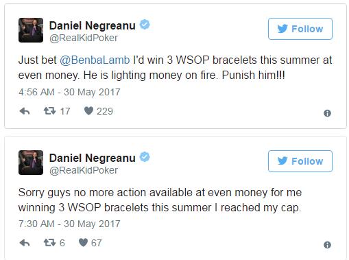 推文大意:刚刚和BenbaLamb做了一个同额赌注打赌,我将在今年夏天赢得三副WSOP金手镯。他是在烧钱。我要惩罚他!!!对不起,不再接受我赢得三副WSOP金手镯的同额赌注打赌,已经到了封顶额。