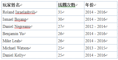 近3年玩家入围WSOP钱圈数据如下: