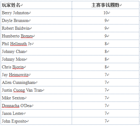 在入围WSOP主赛事钱圈的玩家中也有多次入围的,比如Johnny Chan,Chris Bjorin,Doyle Brunson和Phil Hellmuth。