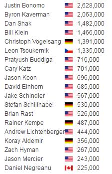 或许有点意外的是,5名“业余牌手”也进入了第三天的比赛,而且全部都进入了筹码量排名榜前十——Dan Shak第三(148.2万),Bill Klein第四(133.5万),Cary Katz第八(70.1),David Einhorn第十(68.5万)