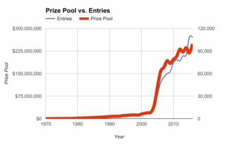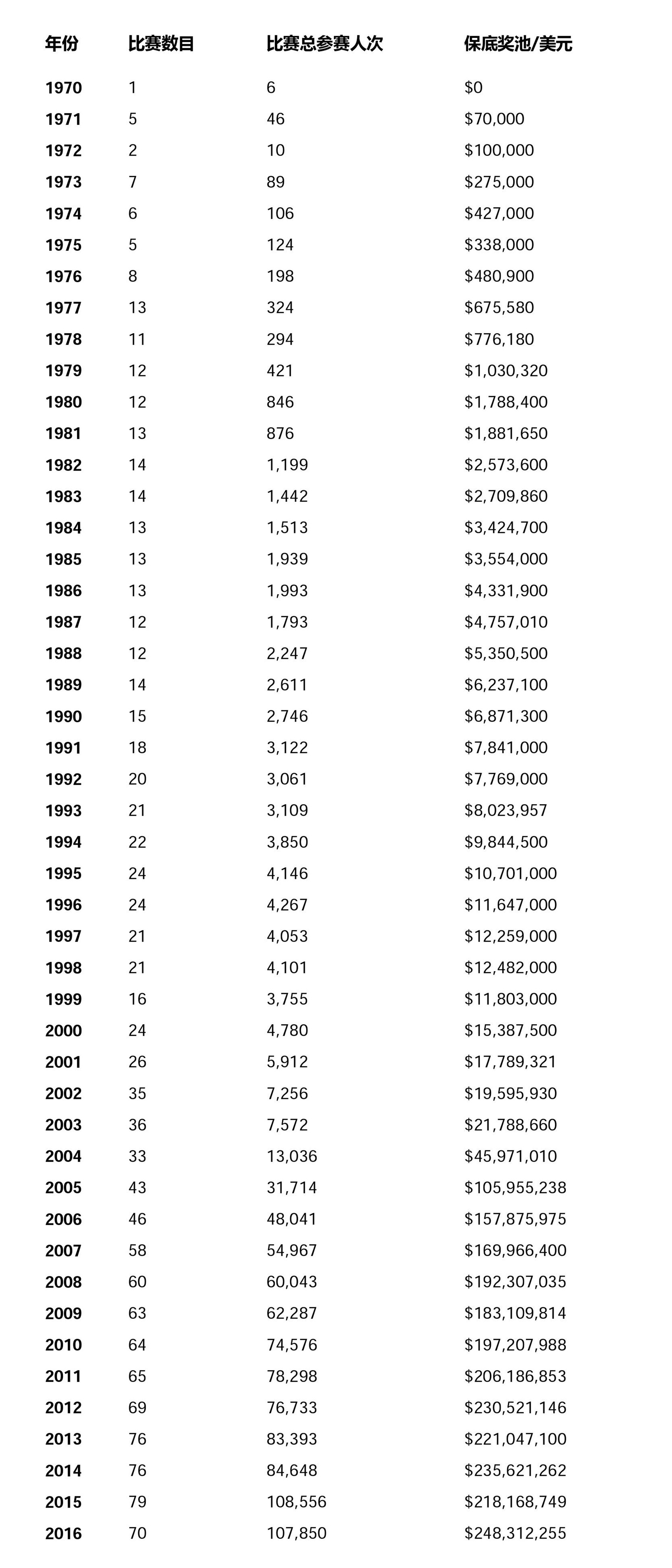 1970-2016年WSOP赛事情况表: